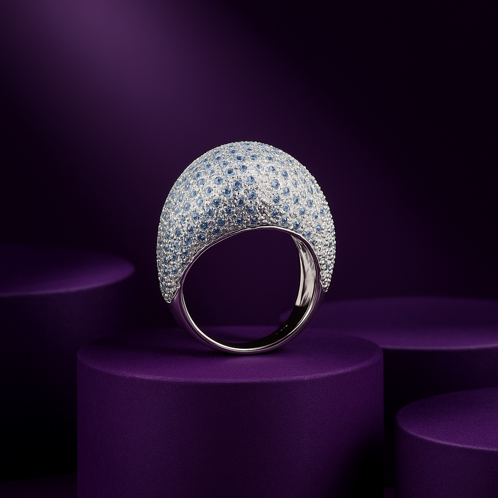 A glamorous Dome Pavé Cocktail Ring embellished with vibrant Aqua Diamonds and shimmering white accents. Expertly crafted in Rhodium Plated 925 Sterling Silver, inspired by bold European design.