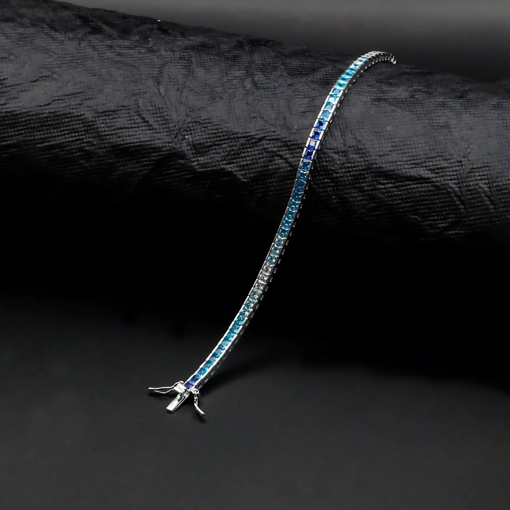 Dive into the serene elegance of this mesmerizing tennis bracelet. Featuring square-cut blue sapphire CZ stones arranged in a gradient from icy light blue to deep ocean blue, each stone is delicately set in a rhodium-plated 925 sterling silver frame. Its sophisticated Italian-inspired design makes it perfect for both everyday luxury and special evening wear. The secure clasp ensures a comfortable fit with durability to last.