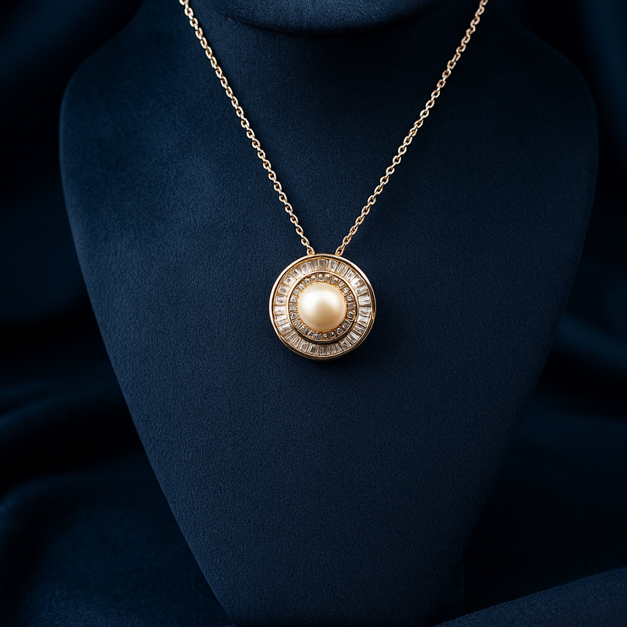 A timeless beauty, this pendant features a lustrous pearl encircled by concentric rows of baguette-cut and round white CZ stones. The luxurious rose gold plating enhances its sophisticated appeal, perfect for both daily wear and special occasions.