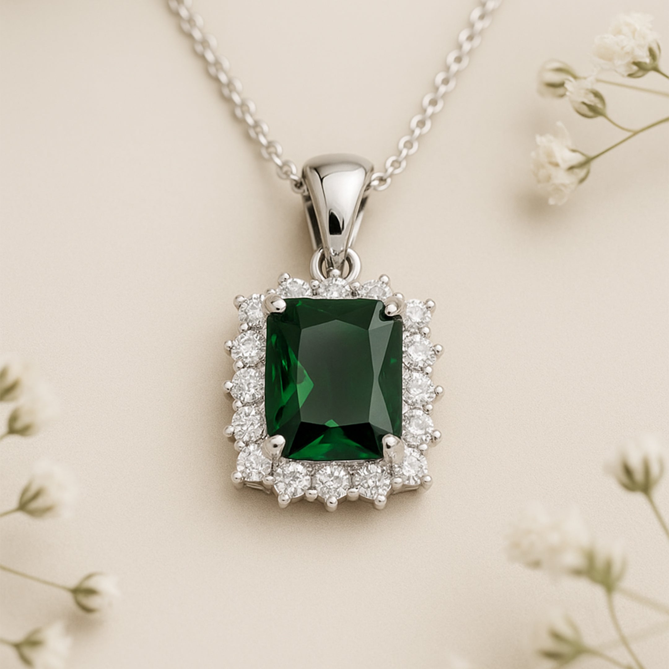 Command attention with the rich look of Emerald Green. This pendant showcases a deep green princess-cut CZ framed by a halo of dazzling white stones. It’s a must-have for those who love vintage charm with modern brilliance. Lightweight yet luxurious, it adds just the right charm to any neckline, makes them the ideal pick for Party wear, formals, or daily luxe.