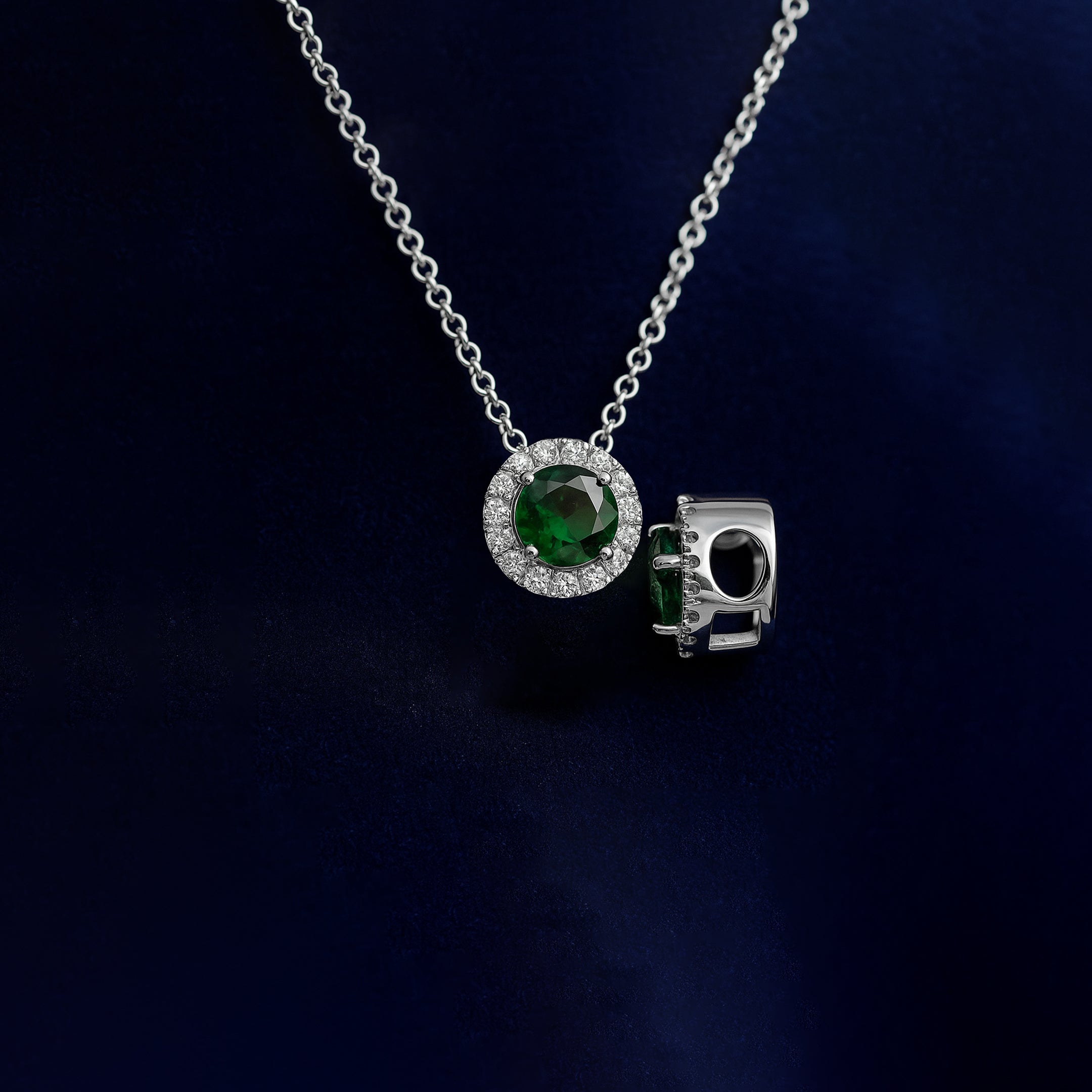 Experience the timeless charm of European style Jewellery with Shubha’s exquisite Emerald Eternal Radiance Pendant. At the heart of this elegant creation rests a Vivid Green Emerald Gemstone, symbolising passion and strength. The Central Diamond is surrounded by a dazzling Halo of White Diamonds, expertly set to enhance brilliance and radiance, ensuring every glance captures light from every angle.