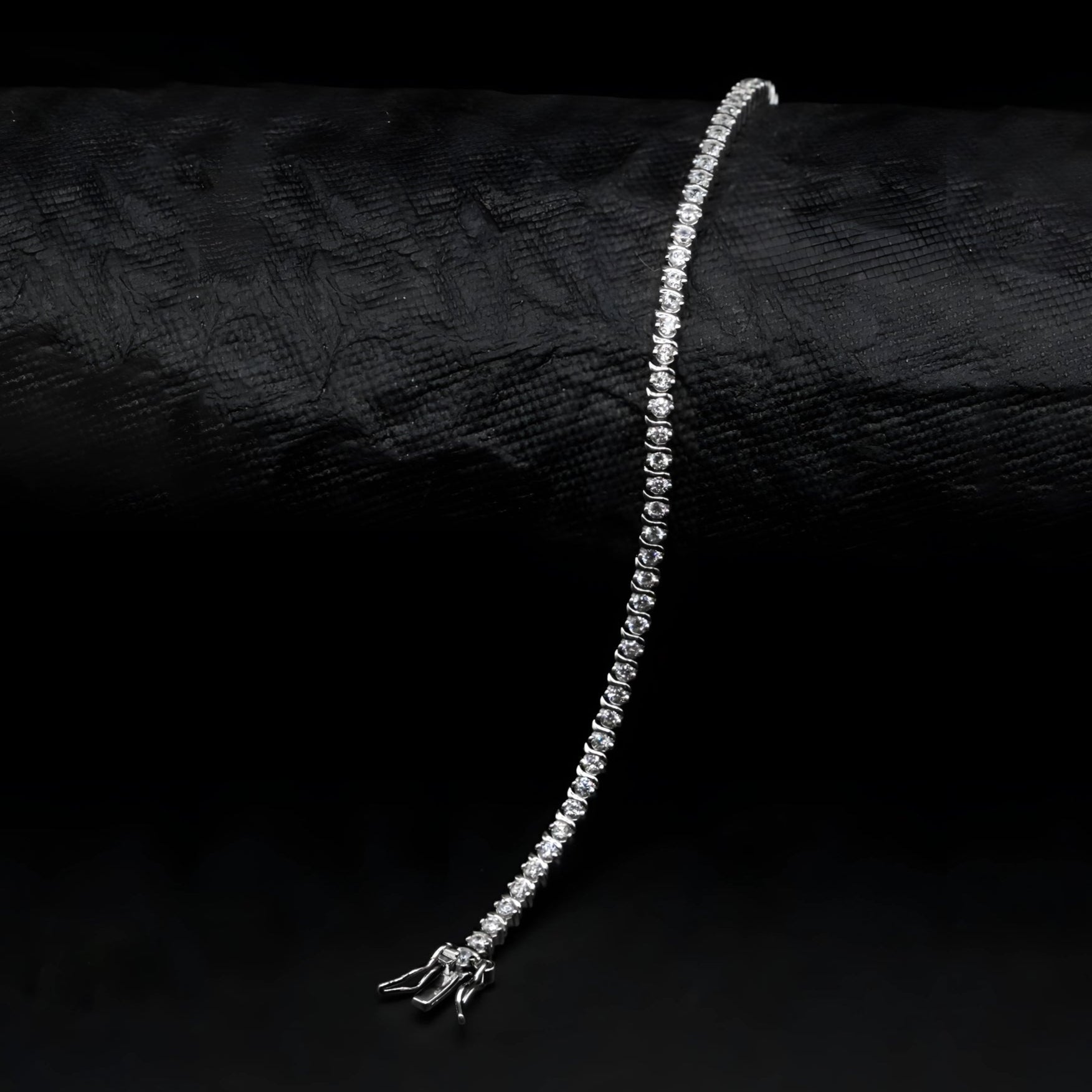 Add timeless sophistication to your collection with this classic tennis bracelet featuring round brilliant cut white CZ stones. Each stone is precisely set in a secure four-prong basket setting, enhancing their radiant sparkle while giving the piece a real diamond look. Crafted in premium rhodium-plated 925 sterling silver, the design follows a slim, minimal single-line silhouette that makes it perfect for stacking, bridal jewelry, or daily luxury styling. Inspired by Italian craftsmanship, it combines elegance with durable comfort.