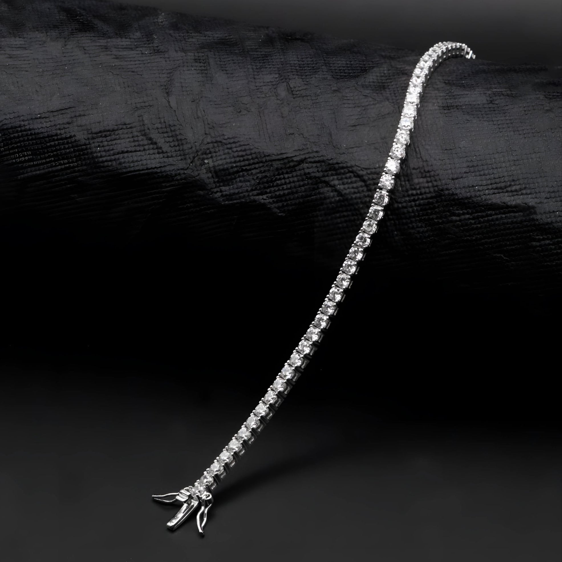 A timeless masterpiece, this tennis bracelet features brilliantly cut round white CZ stones set in a secure four-prong setting, giving it the luxurious sparkle of real diamonds. Crafted from premium rhodium-plated 925 sterling silver, each stone is meticulously arranged in a classic single-line tennis design that hugs the wrist gracefully. Inspired by Italian diamond jewelry aesthetics, this bracelet is perfect for bridal wear, evening parties, or daily elegance.