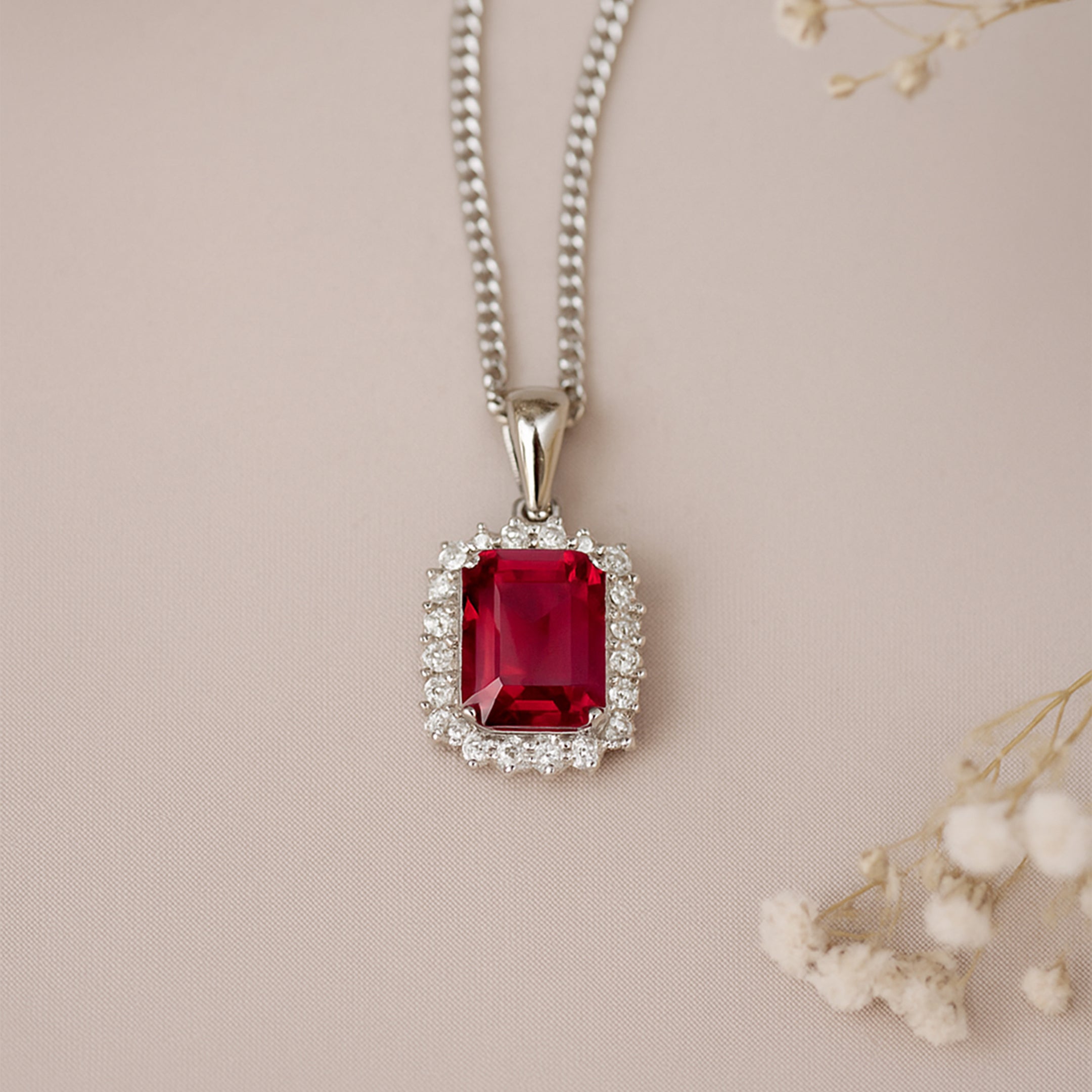 Command attention with the Rich Look of Ruby Red. This pendant showcases a Deep Ruby Princess-cut CZ framed by a halo of dazzling white stones. It’s a must-have for those who love vintage charm with modern brilliance. Lightweight yet luxurious, it adds just the right charm to any neckline, makes them the ideal pick for Party wear, formals, or daily luxe.