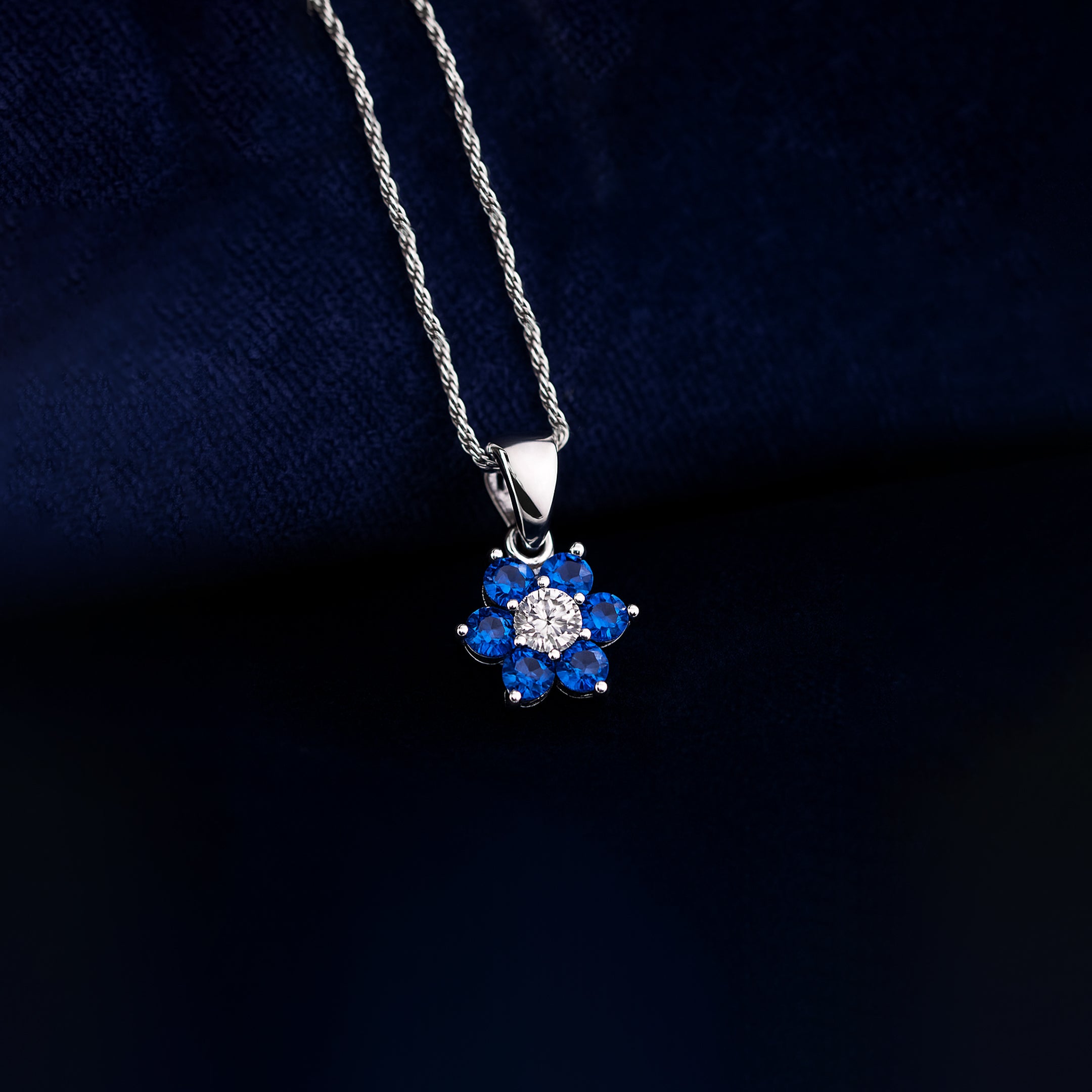 Floral Pendant blooms with brilliance. Crafted in pure 925 sterling silver with a rhodium polish, High-Grade Blue Sapphire and White Color Diamonds are arranged like petals around a radiant center. Lightweight yet luxurious, it adds just the right charm to any neckline, makes them the ideal pick for Party wear, formals, or daily luxe.